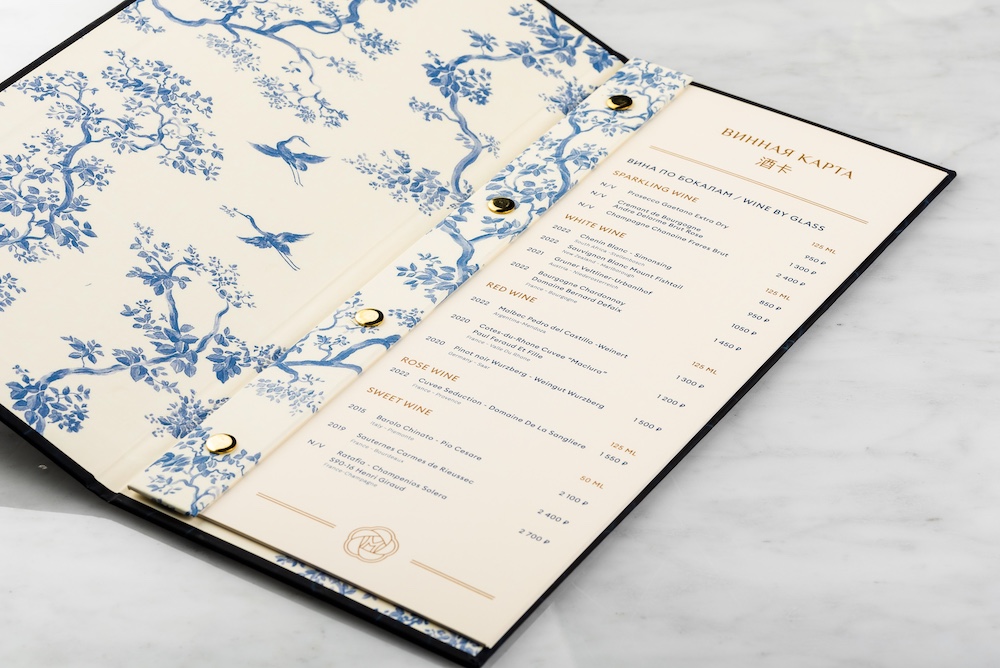 Результатом нашей работы стало премиальное меню уникального дизайна в формате папки в твердом переплете. Текстура обложки меню напоминает китайский фарфор с множеством трещин. Тактильно приятная софт-тач ламинация, бесцветное фактурное тиснение трещин и золотое тиснение логотипа в центре делают продукт неповторимым.